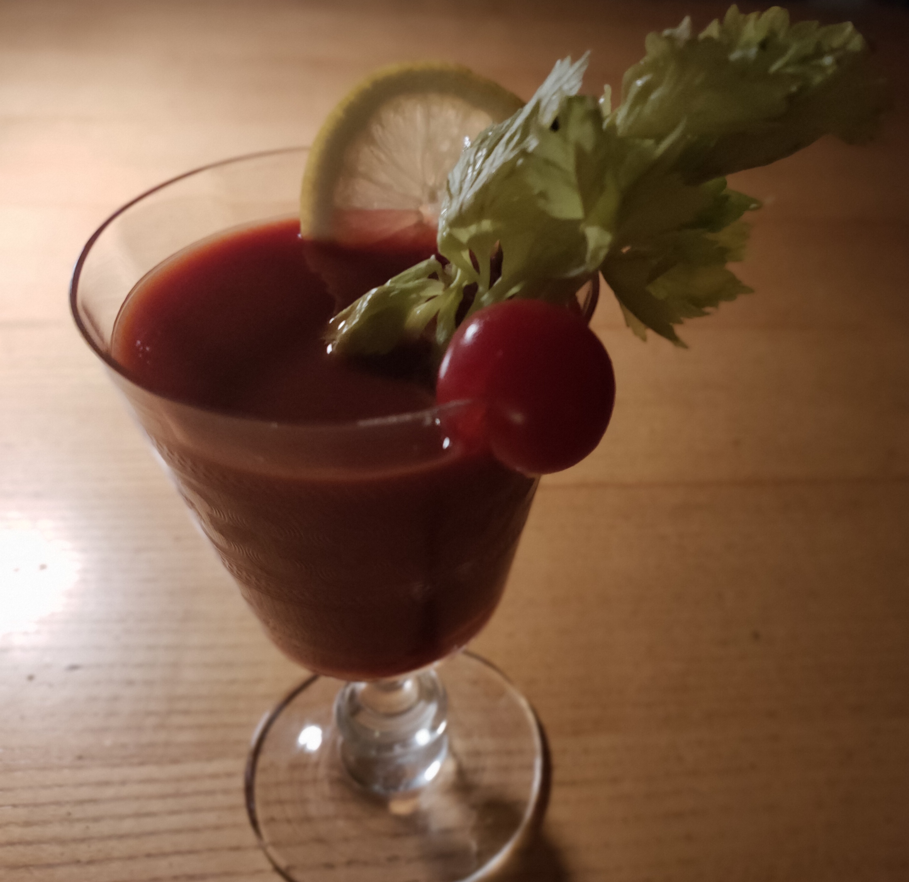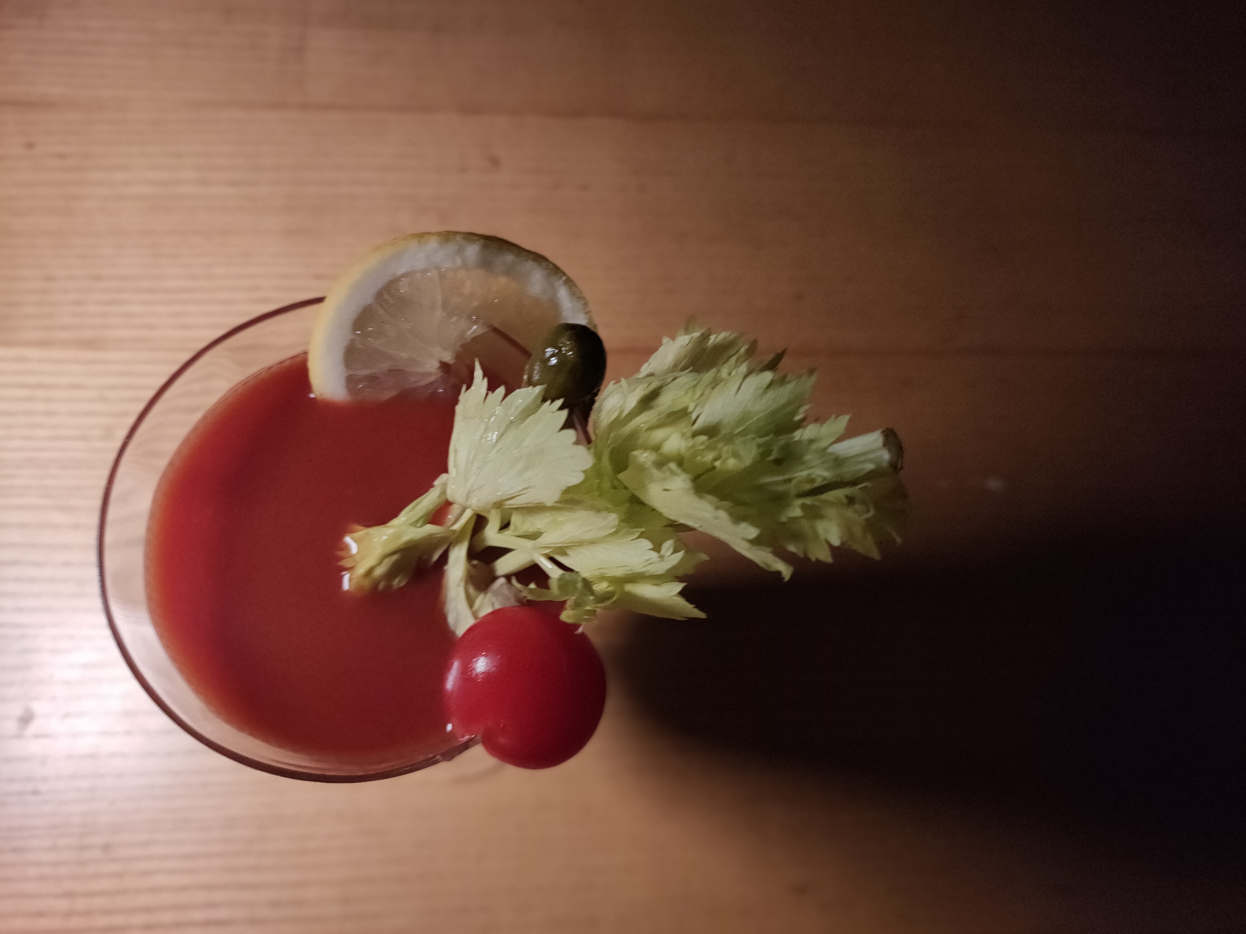 - Strain over ice into the prepared highball glass. Garnish with a celery stalk, a pickle slice, and a lemon wedge.